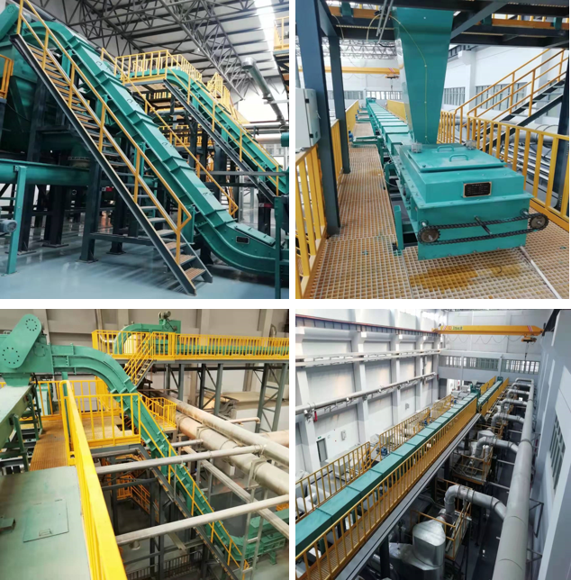 输送量:20~30m³/h,刮板宽度450~600 mm,大倾角输送机倾角55°,S型垂直输送机倾角90℃。