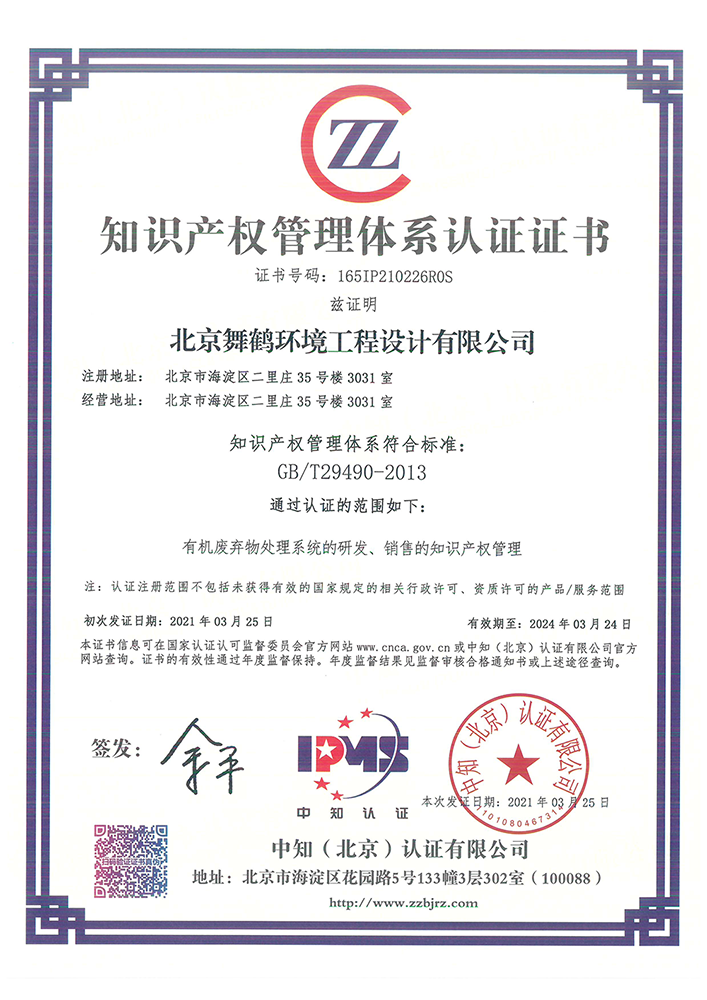 公司快讯:我司获得“有机废弃物处理系统”的研发、销售的《知识产权管理体系》认证。