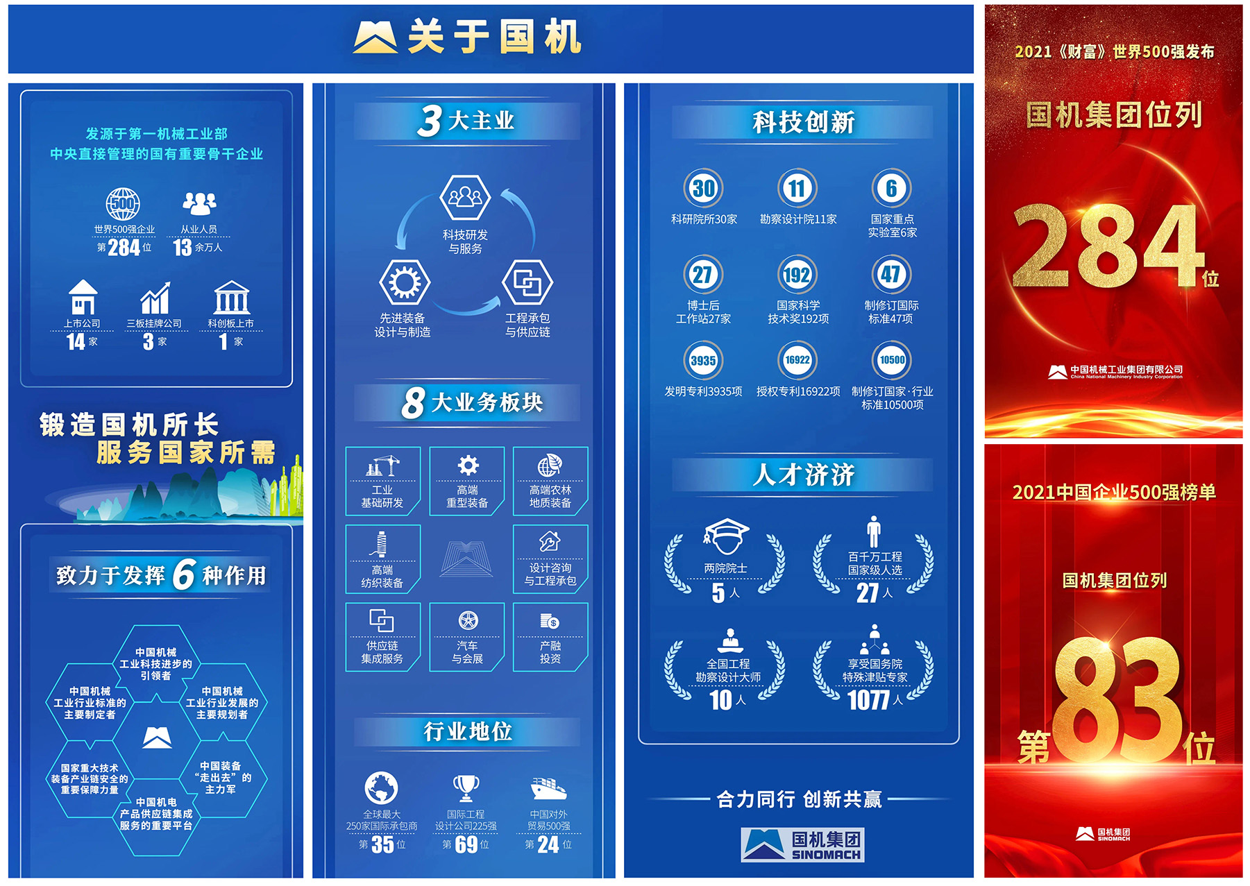 “国机集团”全称“中国机械工业集团有限公司”,是中央直接管理的国有重要骨干企业,发源于第一机械工业部,由原机械工业部70多家科研设计院所、装备制造和工贸企业沿革发展而来。国机集团目前拥有28家直接管理的二级企业,13余万从业人员,13家上市公司,是世界500强企业,连续多年位居中国机械工业百强首位。