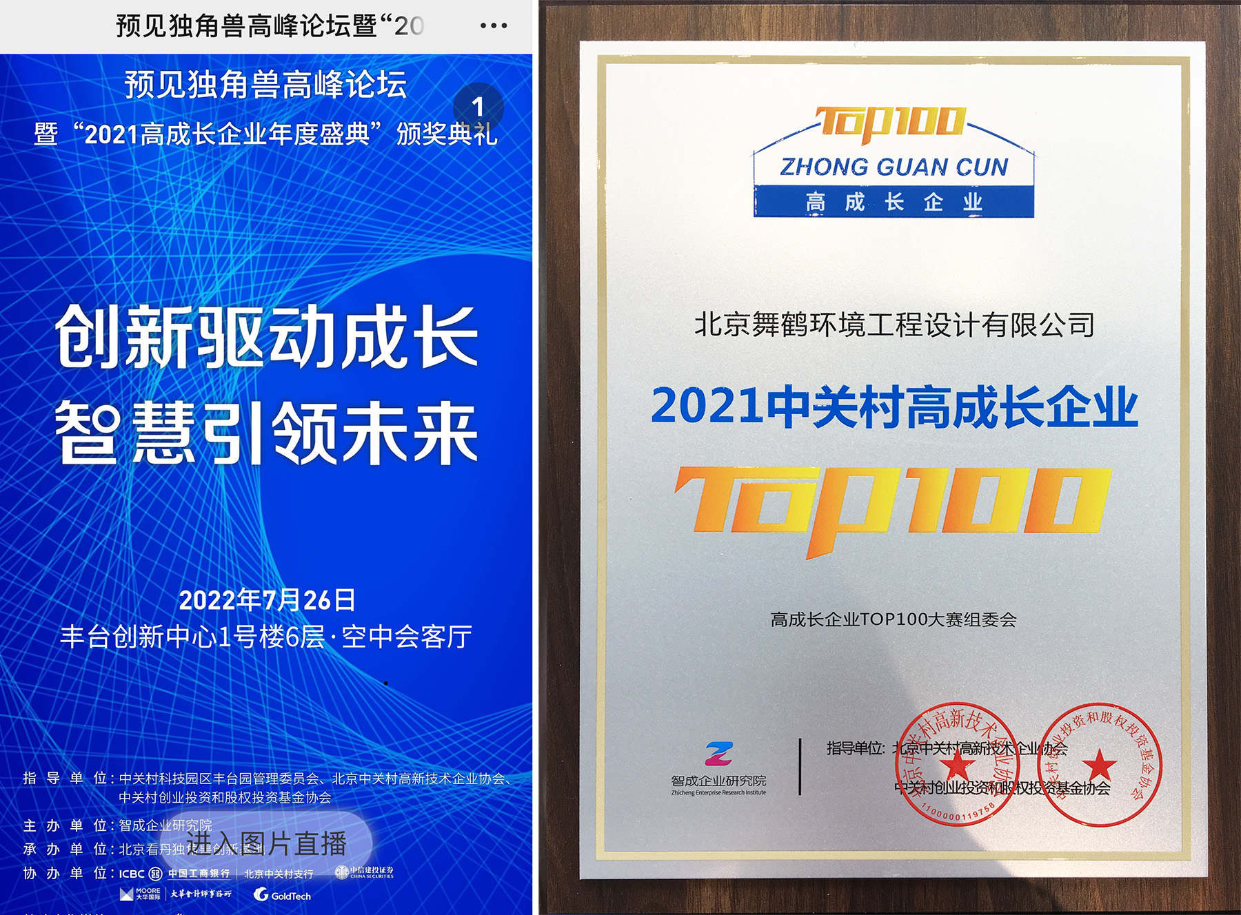 北京舞鹤环境工程设计有限公司做为北京市专精特新企业的亮眼表现,实现了高速成长,从数千家参选企业中脱颖而出,成功入选“2021中关村高成长企业TOP100” 上榜榜单并获颁该奖项。本年度系列活动评选阶段的2021高成长企业TOP100大赛活动自去年9月正式启动,历时6个多月,经由项目征集、榜单初筛、项目初审、复审路演等四个环节,遴选出100家最具有发展潜力和行业代表性的高成长企业。最终进入榜单的100家企业符合北京市构建高精尖经济结构的定位,不断强化科技创新产业的引领示范效应,是一批拥有自主知识产权核心技术、具有自主创新能力、兼具强科技实力和高成长性的高成长企业。