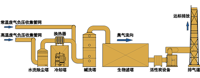 本技术实现含尘、含油湿热气体温度调节的组合除臭装置,通过除尘、降温、吸附、生物过滤等综合处理工艺对含尘、含油的湿热恶臭废气进行降尘、降温、除油及除臭处理,实现含尘、含油、高热、高浓度复合异味气体的达标处理。