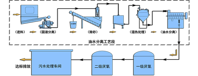 本技术主要采用油水分离+两步厌氧法,采用高效出渣、除油工艺实现物料中油、水、渣三相分离,再通过两步厌氧处理工艺,针对悬浮固体多、含油率高的高浓度有机废水,系统耐冲击负荷能力强,运行稳定,避免了一步法不耐高浓度有机酸的缺陷。解决了传统工艺的运行不稳定、运行成本高、操作环境差、产水水质波动大等缺陷,该方法实现了对餐厨垃圾渗滤液和高油脂有机废水处理的高效性和稳定性。